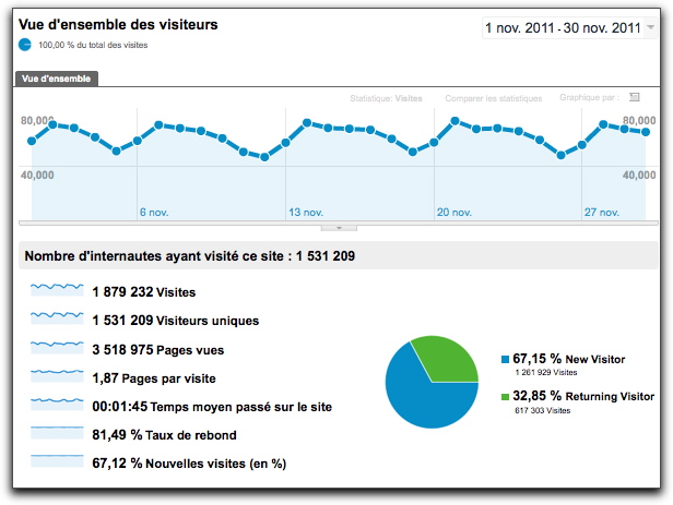 Les statistiques de fréquentation ci-dessous concernent le mois de novembre 2011, mois de fréquentation moyenne. Elles sont fournies par Google Analytics.