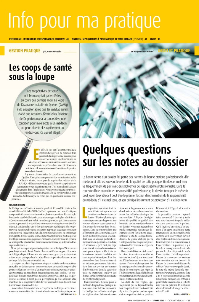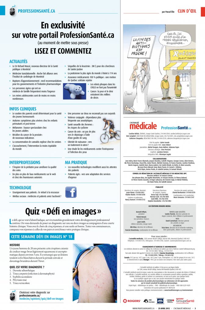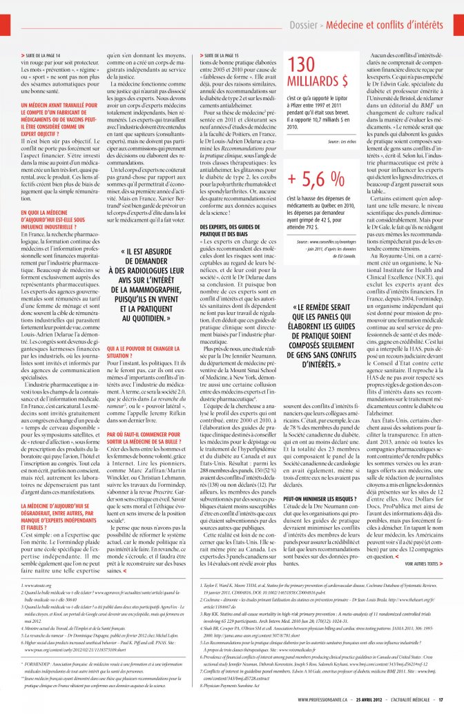 J’ai été contacté en mars 2012 par une journaliste québécoise, Fabienne Papin, qui réalisait un dossier sur les conflits d’intérêts et les médecins. Je ne connaissais pas son journal "L’Actualité Médicale", bimensuel professionnel canadien au format tabloïd.