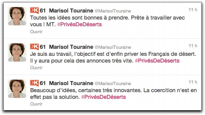 Cette opération de communication a été symbolisée sur Twitter par le hashtag (mot-clé) #PrivésDeDéserts repris des centaines de fois. Elle a été intégrée le jour même par les agences de presse et les principaux médias français. C’est un véritable succès médiatique qui a abouti après une douzaine d’heures à la réaction bienveillante de la ministre Marisol Touraine, toujours sur Twitter :